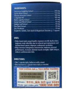 - Dâm dương hoắc (50mg): Một loại thảo dược truyền thống được sử dụng để hỗ trợ tăng cường sinh lý nam, bổ thận tráng dương, tăng ham muốn và khả năng cương cứng.